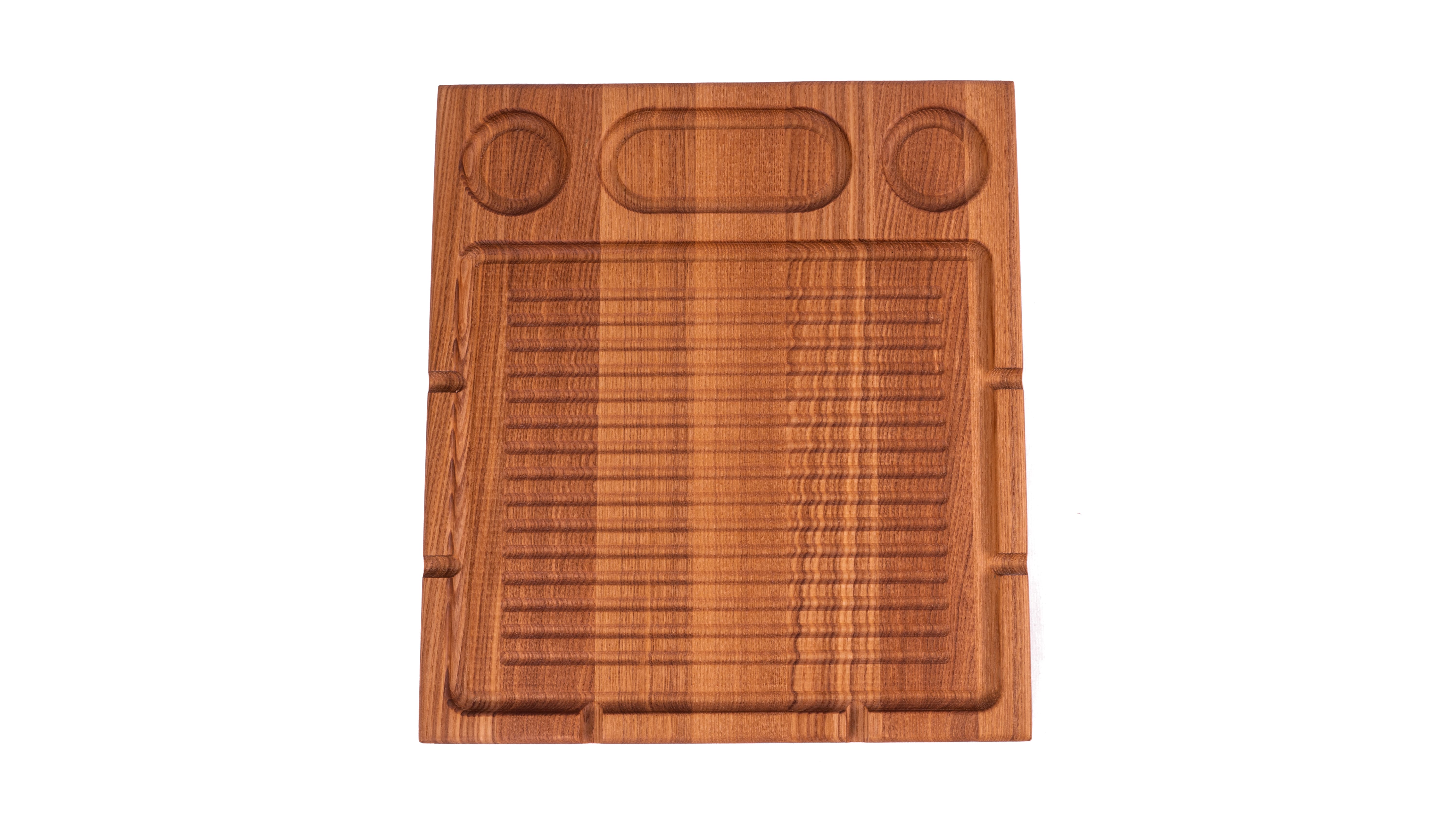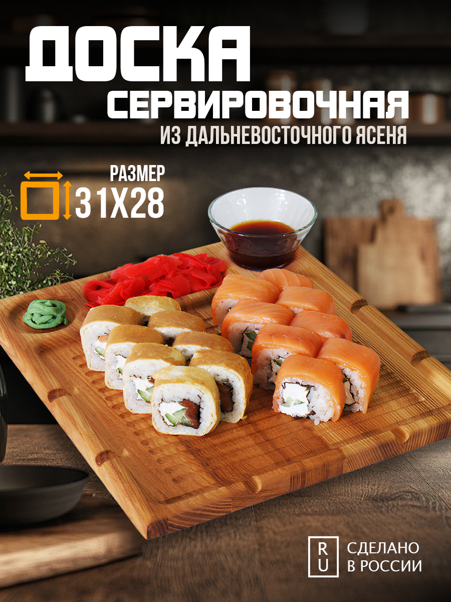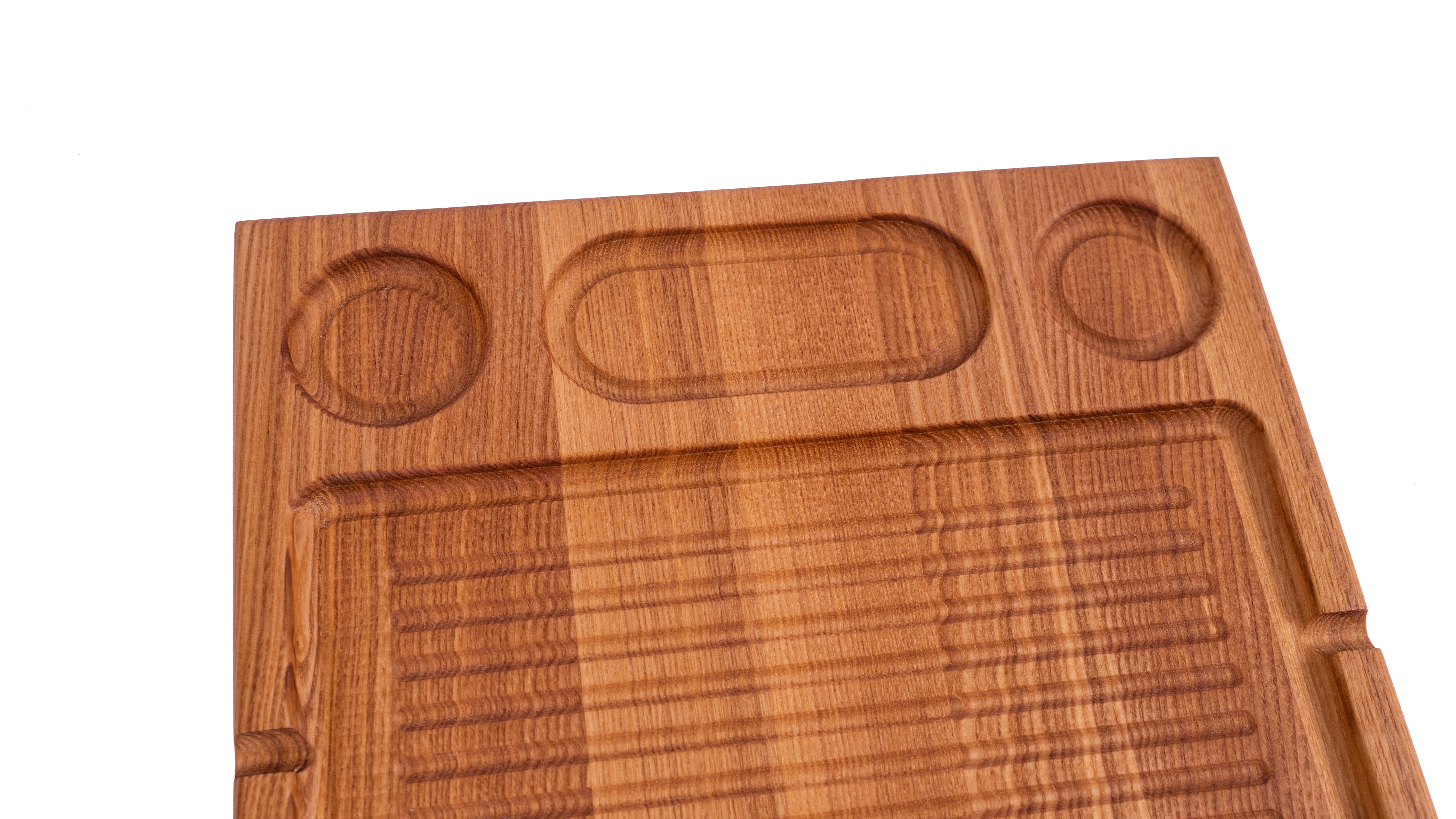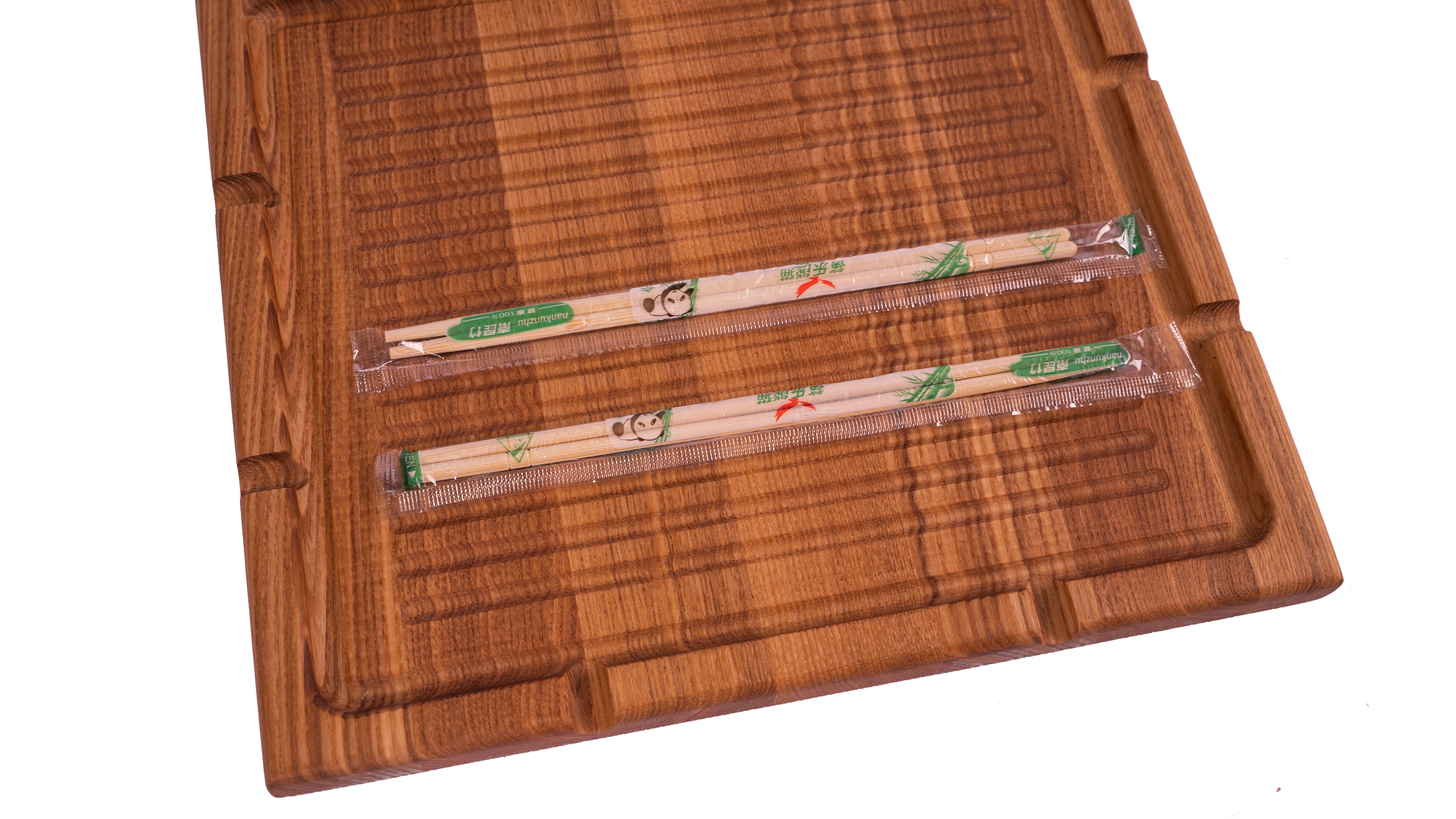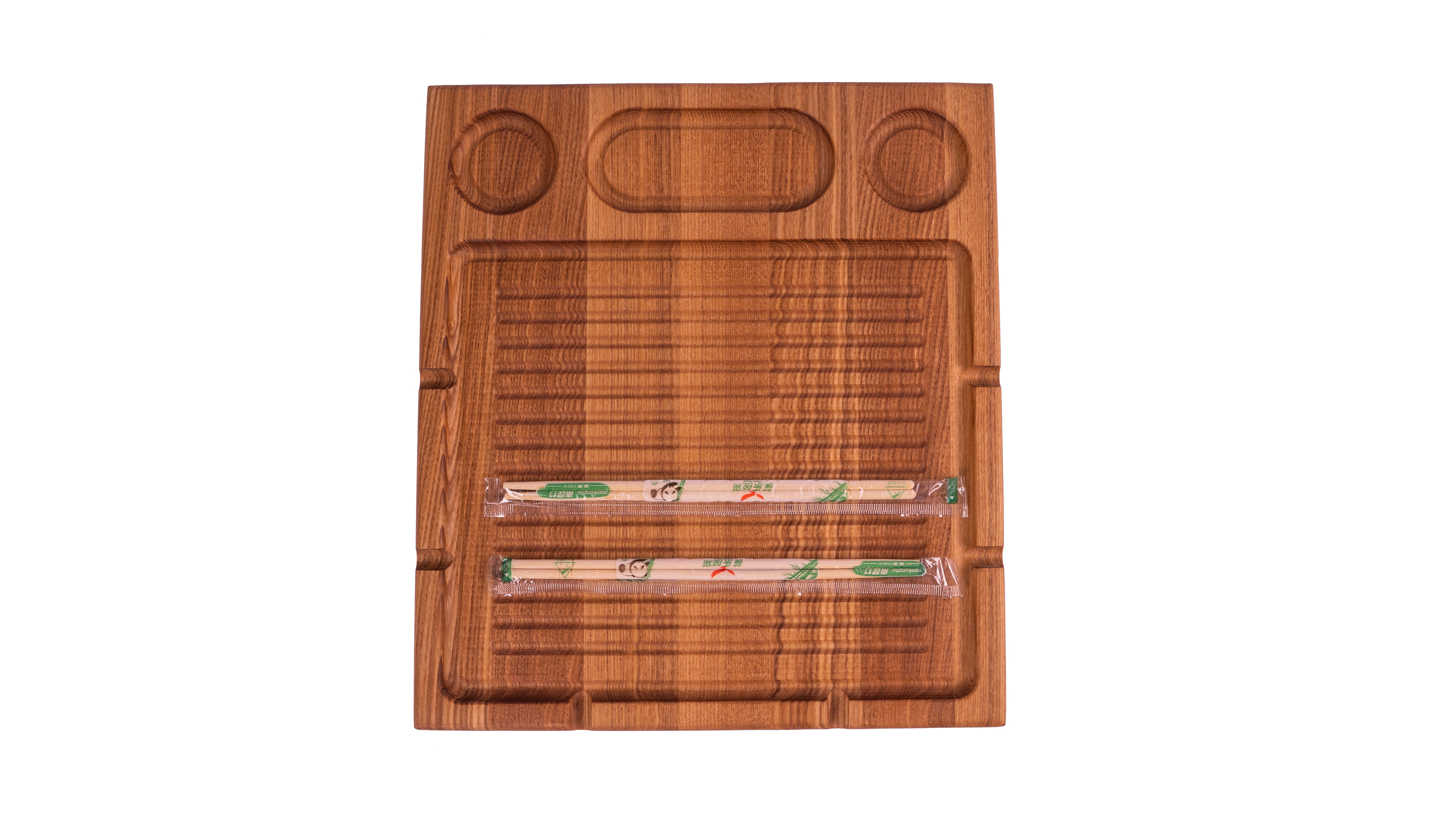 Деревянная менажница «Квадратная» выполнена из благородного дальневосточного ясеня. Она обладает исключительной устойчивостью к износу и растрескиванию. Этот уникальный предмет идеально подходит для сервировки суш и роллов, фруктов, орехов, сыров, мяса и даже небольших десертов. Специальные углубления по периметру, предназначенные под палочки для суши и роллов, и секции под соусницы диаметром 50 мм позволяют фиксировать посуду.