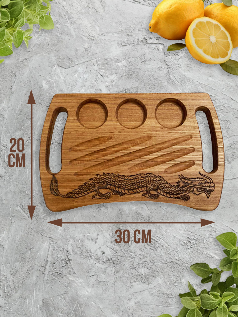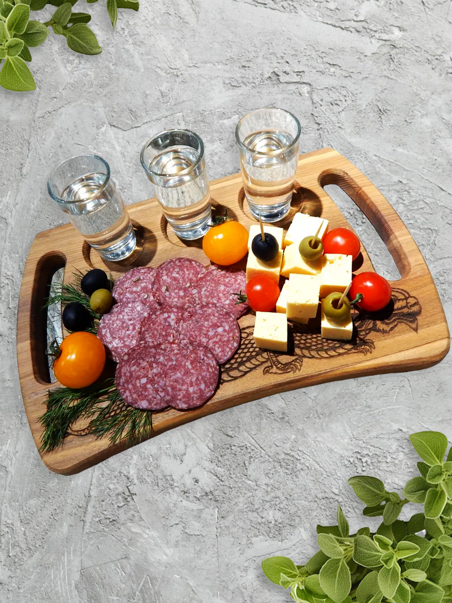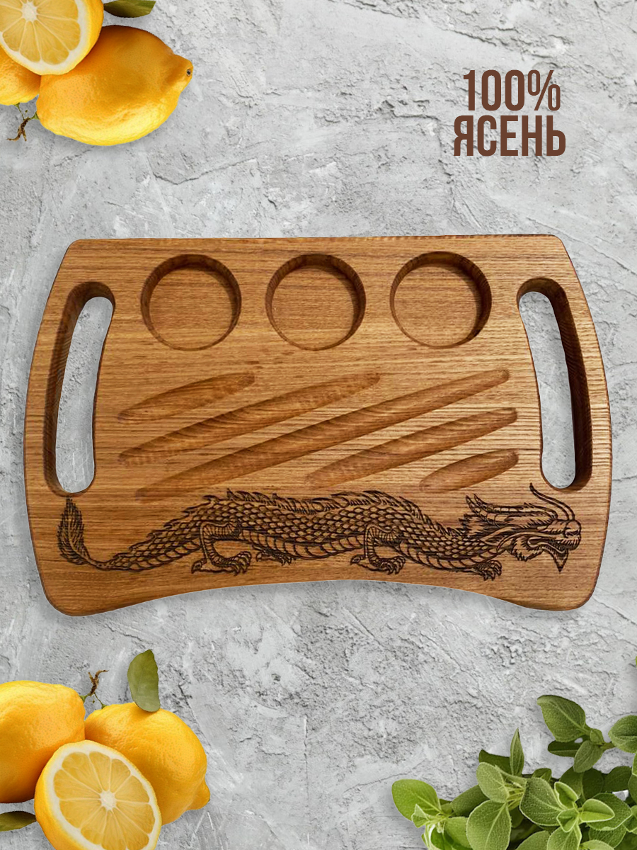 Деревянная сервировочная доска выполнена из благородного дальневосточного ясеня. Она обладает исключительной устойчивостью к износу и растрескиванию. Этот уникальный предмет идеально подходит для сервировки закусок, нарезки, десертов или сочного стейка. Специальные секции под соусницы и шоты диаметром 47 мм позволяют фиксировать посуду.