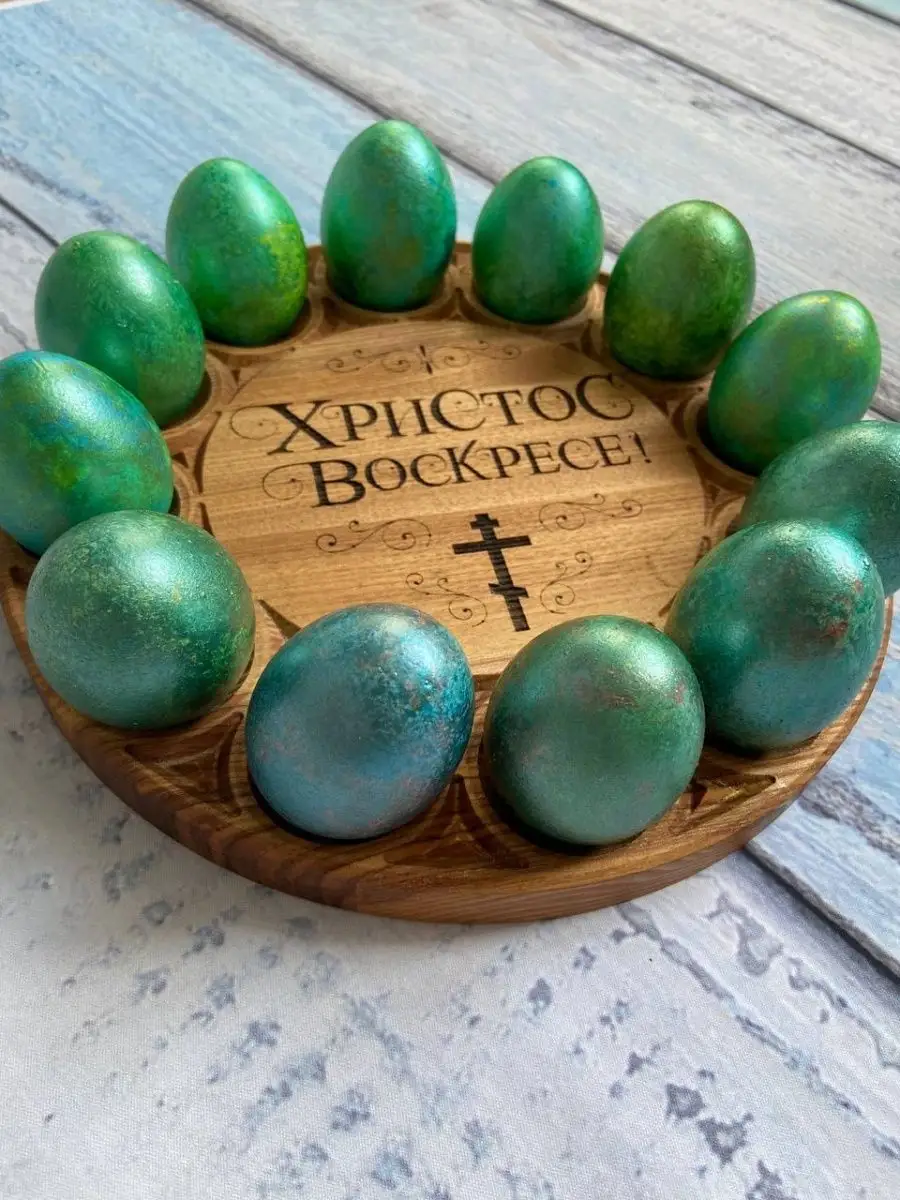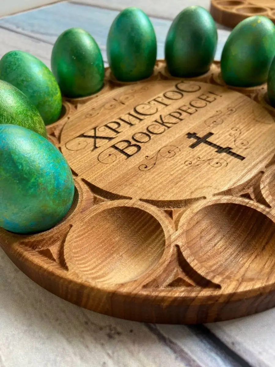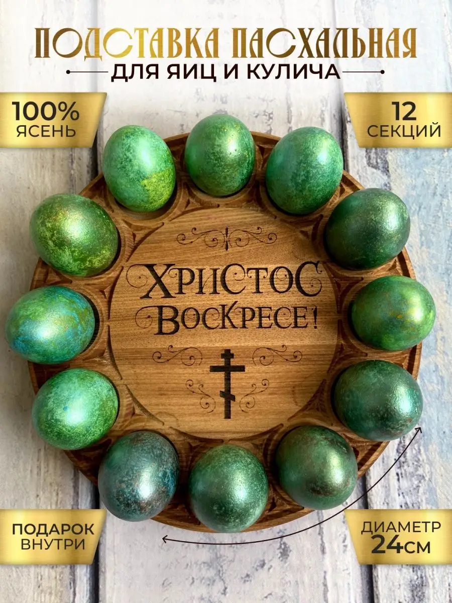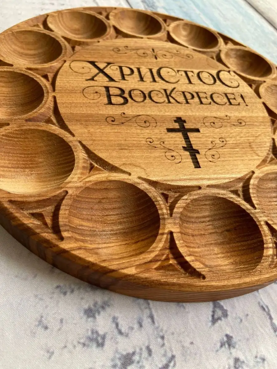Эта изящная деревянная подставка выполнена из благородного дальневосточного ясеня. Она обладает исключительной устойчивостью к износу и растрескиванию. Пасхальная тарелка станет достойным украшением вашего стола. Предусмотрено 12 секций, предназначенных для размещения расписных яиц, которые окружают центральную секцию, созданную специально для пышного кулича диаметром 140 мм.